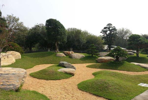 (六)栽植。园林绿化工程中栽树前要对劈裂、折伤的根茎开展修剪,要求剪口光滑平整,有利于愈合。有病菌的地区要开展土壤或根处消毒,难生根的名贵树种可浸生根粉溶液。施基肥,拣出砖石瓦块等杂物,按定植点栽树,填一多半土用脚踏实后再填。行列式植树要求工整保持一致;丛状式栽植或弧形栽植、对称栽植等要合乎设计要求。