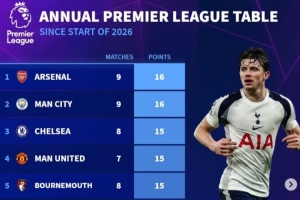 2026英超积分榜:枪城车魔+樱桃分列前五,热刺9轮4分垫底